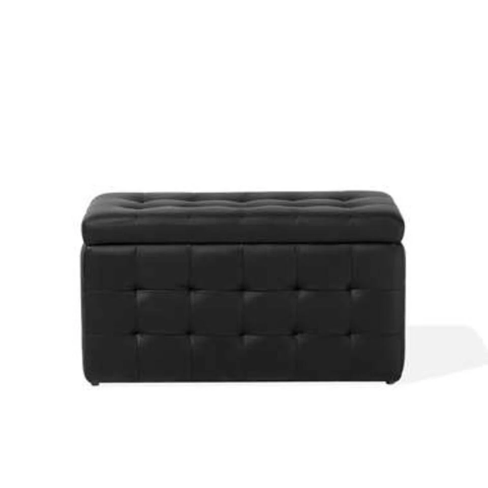 Zwarte hocker met veel opbergruimte. Deze hocker zal je overtuigen met zijn uitstraling en functionaliteit. Hij kan op vele manieren worden gebruikt: als poef, extra zitplaats, een voetenbank of accessoire waar je ook veel in kunt opbergen. De stevige constructie gemaakt van hout is bedekt met synthetisch leer en daarom chique en zeer comfortabel tegelijkertijd.