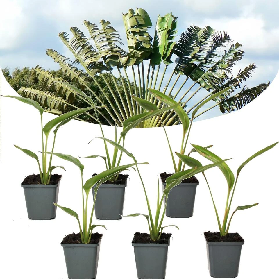 Breng jouw tuin in een tropische sfeer met deze prachtige plant! De Ravenala Madagascariensis, in Nederland beter bekend onder de naam Reizigerspalm, komt oorspronkelijk uit Madagaskar. De palm heeft zijn naam te danken aan het nut van zijn bladeren. Deze palm kan namelijk water vasthouden in zijn scheuten, dat werd gedronken door voorbijkomende reizigers. De Ravenala Madagascariensis lijkt in eerste instantie sprekend op de Strelitzia. Dit komt omdat de palm familie is van de Strelitziaceae. De bladeren van de Reizigerspalm groeien in een symmetrische vorm, waardoor dit in volwassen toestand op een waaier lijkt!